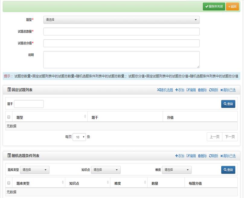 2. 設(shè)置完畢之后下方的“固定試題列表”和“隨機選題條件列表”中的添加進(jìn)行該題型的出題組卷。