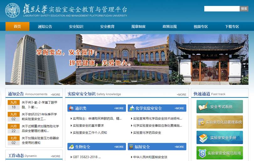 首頁是實驗室安全教育與管理平臺的主索引頁,包括欄目、站內(nèi)搜索、資料下載、友情鏈接、聯(lián)系我們、系統(tǒng)登錄等。將實驗室安全重點信息、熱點等在首頁醒目位置顯示,方便師生瀏覽查詢。