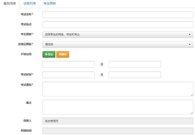 校級管理員能組織面向全校的考試,院級管理員能組織本學(xué)院的考試。管理員根據(jù)實際情況安排不同種類的網(wǎng)絡(luò)考試或自測。 安排考試時,可以設(shè)定考生的范圍、考場IP地址范圍、考試起止日期,這樣可以做到只有符合條件的考生,在指定時間和地點,才能參加考試。