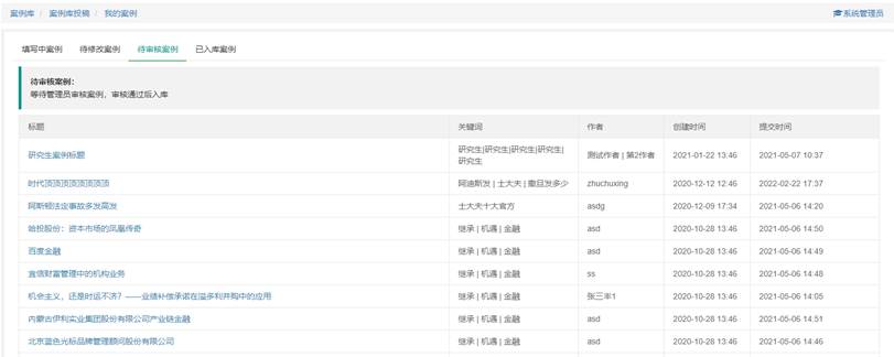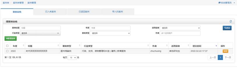 案例管理包括管理員案例管理和投稿用戶個人案例管理。案例管理員管理所有系統(tǒng)中的案例,包括審核投稿的案例,已入庫的案例上下架,批量導(dǎo)入案例和案例附件。個人案例管理可以修改個人未提交或者被退后案例,查看個人已入庫的投稿案例。
