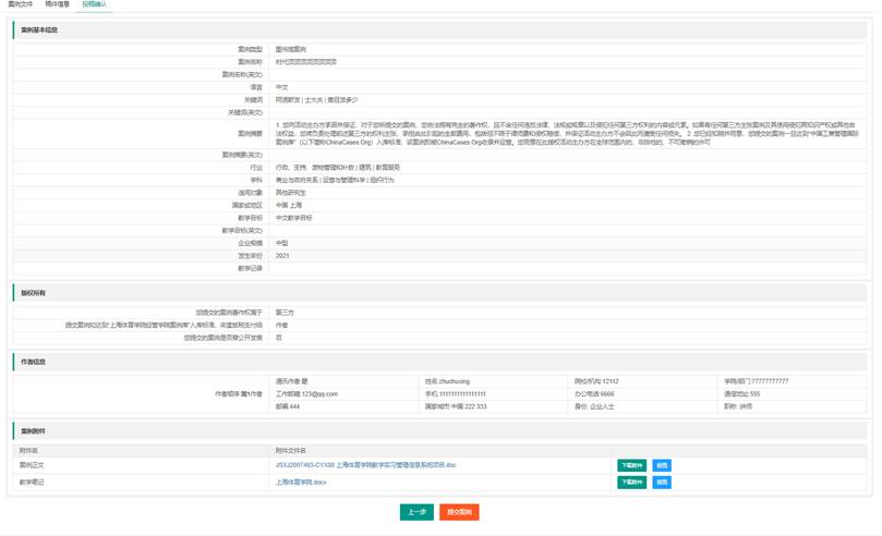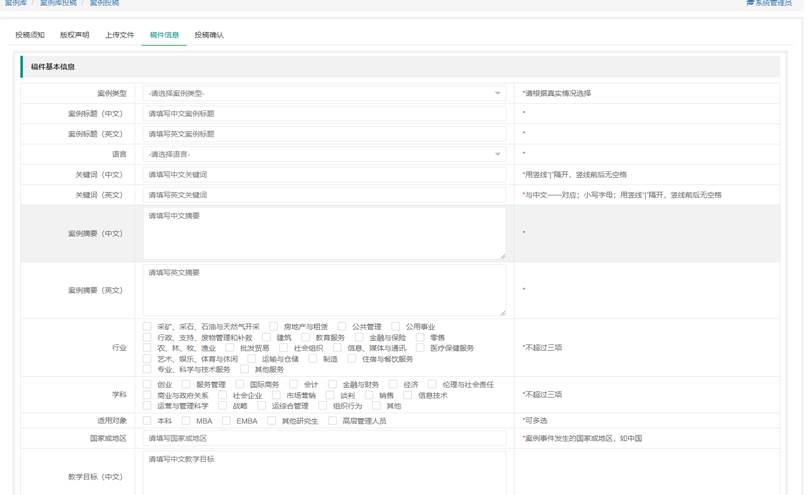 在線投稿模塊包括投稿政策版權(quán)聲明須知、基本案例正文和案例相關(guān)附件的上傳、案例基本信息和作者信息填寫確認提交。