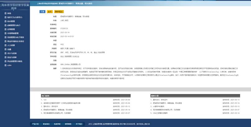 我司為上海體育學(xué)院經(jīng)濟管理學(xué)院開發(fā)的案例庫系統(tǒng),包括“案例庫前臺網(wǎng)站”、“案例在線預(yù)覽”、“案例在線投稿”、“案例管理”、“個人案例管理”、“其他基礎(chǔ)信息管理”。