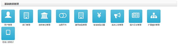 維修區(qū)域管理、維修項目管理、部門管理、維修服務單位管理、用戶管理、維修服務單位管理員設置、維修服務單位設置、維修服務單位服務范圍設置、維修服務人員服務范圍設置、收費類型設置、消息設置、系統(tǒng)公告等。