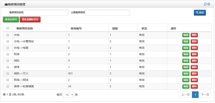 建立維修項目信息,便于按不同維修項目指派不同的維修人,維修項目可分多級,比如第一級分成:水、電、木、泥、油漆、金屬、室外、暖氣、網(wǎng)絡等,第一級水又可以分成水龍頭、水管、閥門等二級項目。