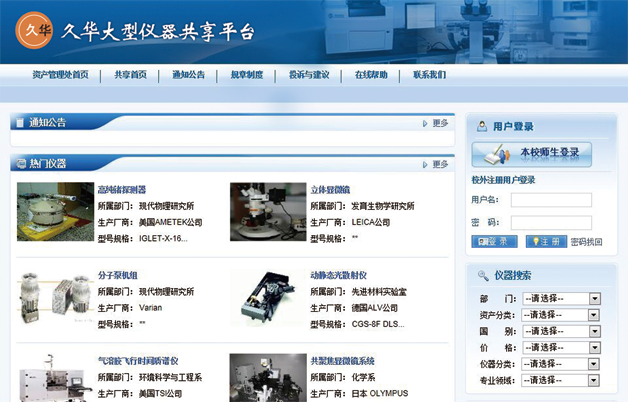 提供儀器信息對(duì)外展示的網(wǎng)站,無需登錄即可查看學(xué)校對(duì)外共享的儀器信息;可展示儀器共享相關(guān)的通知公告、規(guī)章制度等信息;校外人員注冊(cè)后可以預(yù)約儀器,提供用戶意見反饋機(jī)制。